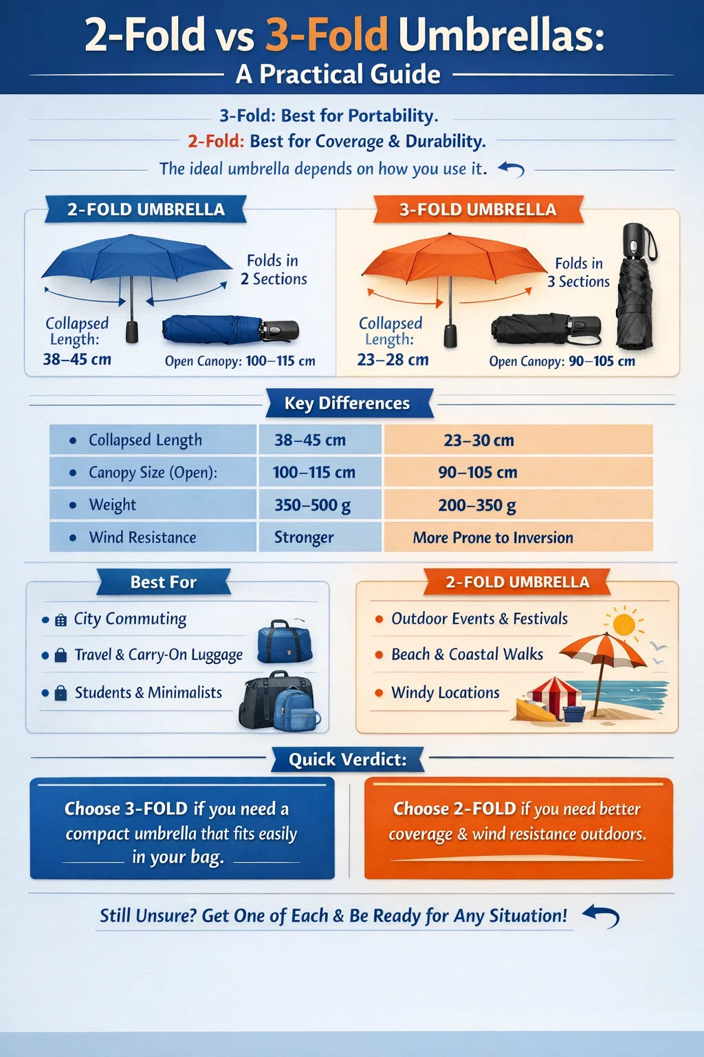De keuze tussen een 2-voudige en een 3-voudige paraplu is echt een kwestie van lifestyle-fit, geen kwaliteitsvraag. Geen van beide is objectief superieur in alle situaties. Hier is de duidelijkst mogelijke samenvatting: