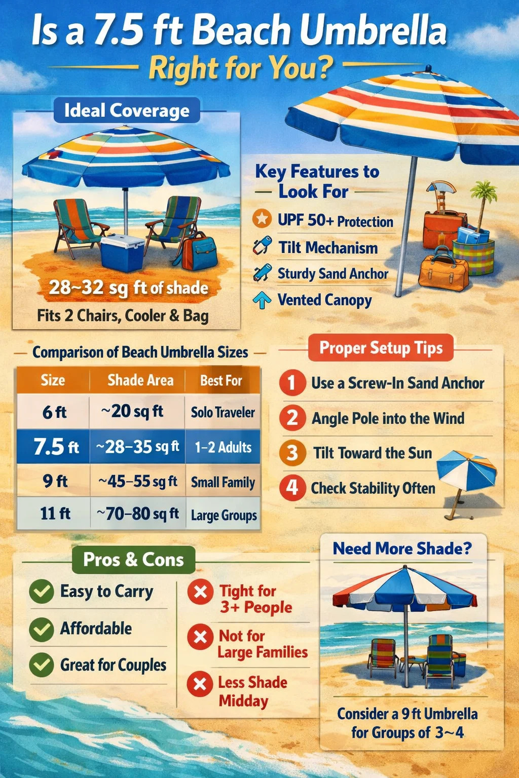 Een parasol in dit formaat weegt doorgaans tussen de 3,5 en 6 pond, afhankelijk van het materiaal – licht genoeg om zonder zweet van de auto naar de kust te dragen. De diameter van de paal ligt meestal tussen 1 inch en 1,5 inch, en de overkapping zit hoog genoeg om comfortabel onder te staan als de zon recht boven je hoofd staat. Deze afmetingen maken 7,5 ft de standaard voor casual strandgebruik, individuele reizigers en koppels die betrouwbare schaduw willen zonder een groot tuig te slepen.