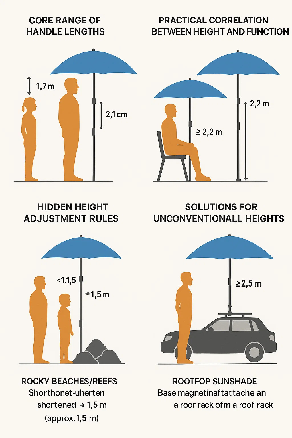 Het volgende is een praktische analyse van parasol hoogtes, gebaseerd op gangbare gebruiksscenario's en ergonomische ontwerpprincipes:
