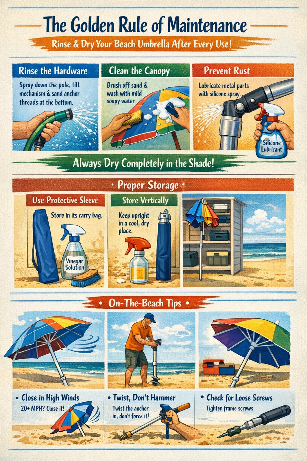Wanneer u terugkeert van de kust, uw parasol is bedekt met microscopisch kleine zoutkristallen en schurend zand. Als deze deeltjes onbeheerd worden achtergelaten, vangen ze vocht op en leiden ze tot schimmel of mechanisch falen.