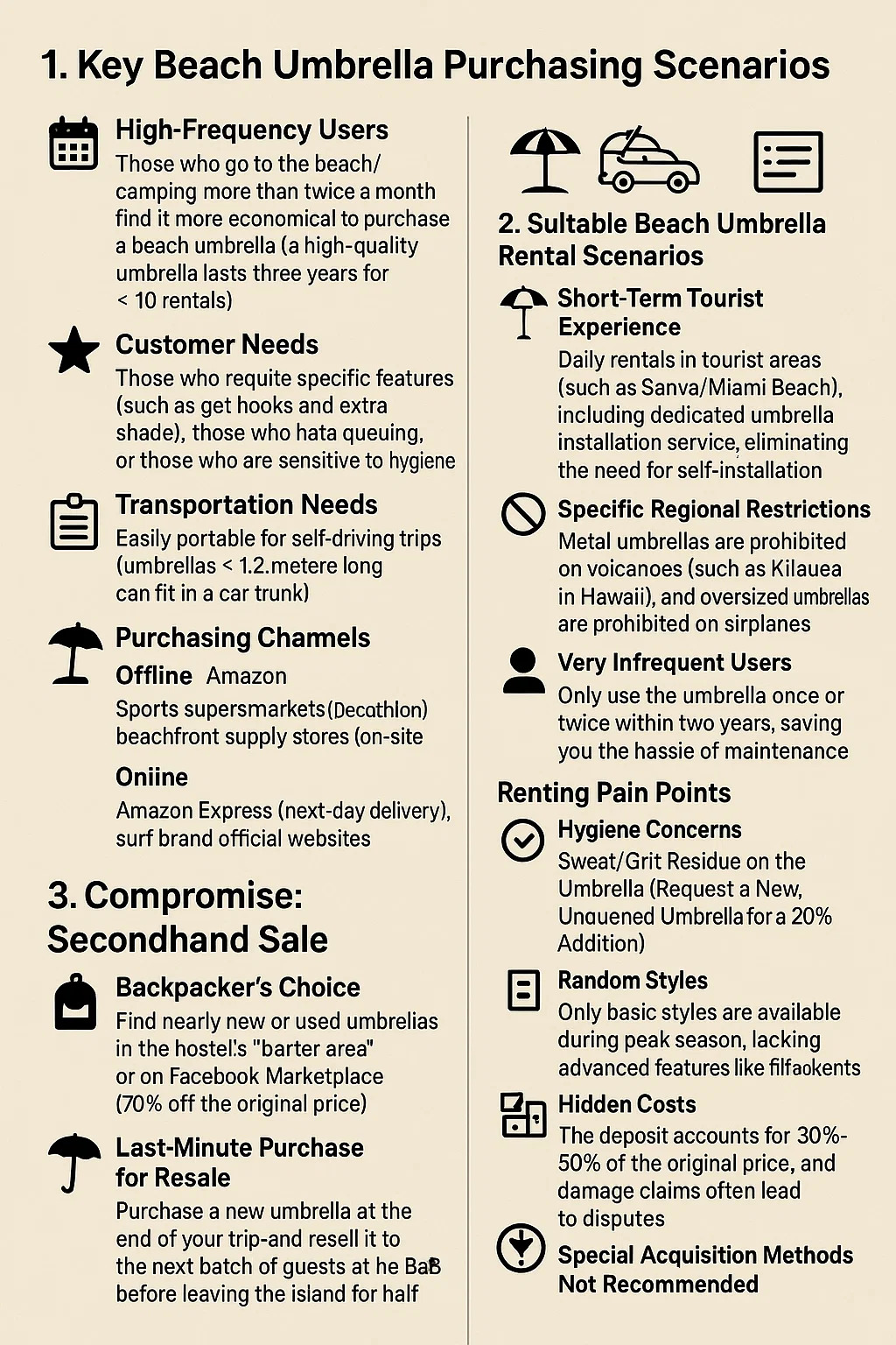 Het verwerven van een Strand paraplu Vereist flexibiliteit op basis van gebruiksfrequentie, trip natuur en budget. Het volgende is een empirische analyse: