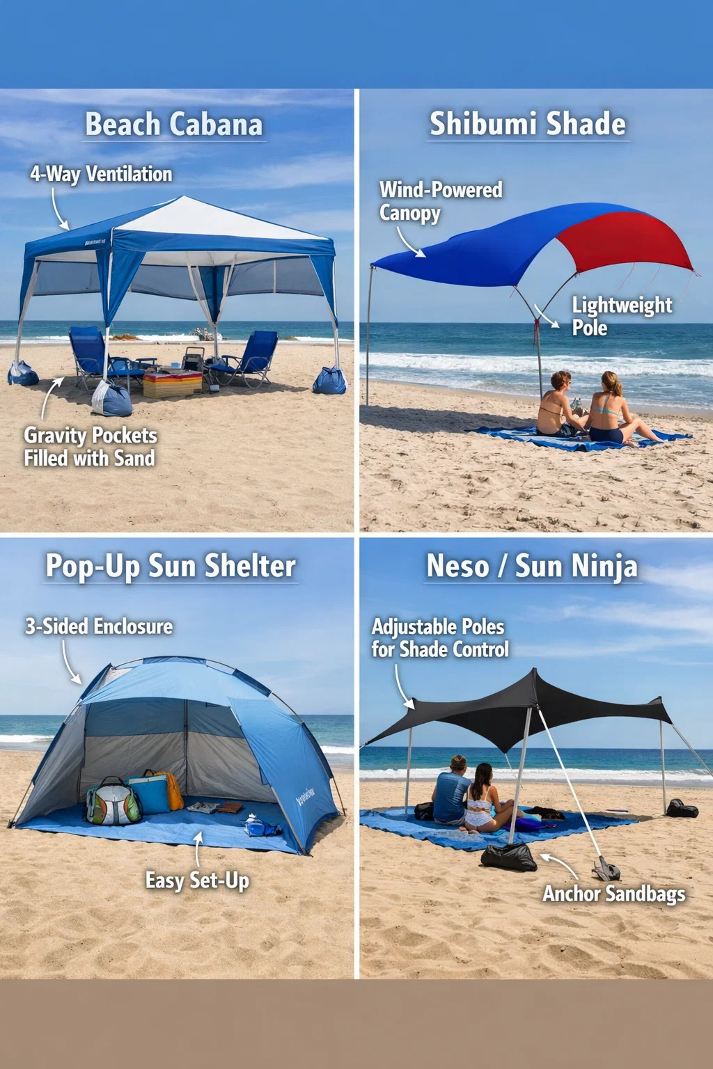 Waarom het beter is: Deze producten zijn meestal aan drie zijden ingesloten, als een halve tent. Voor mensen met kinderen of huisdieren blokkeert het wind-, zand- en UV-stralen vanaf de zijkanten, waardoor een uitgebreidere bescherming tegen de zon wordt geboden.