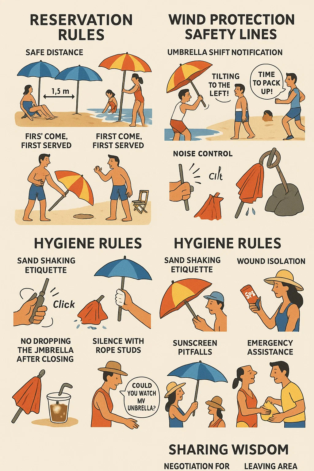Etiquette voor het schudden van zand: Voordat u uw paraplu sluit, schudt u deze drie keer op een afgelegen plek om te voorkomen dat er zand in de boterhammen van anderen terechtkomt.