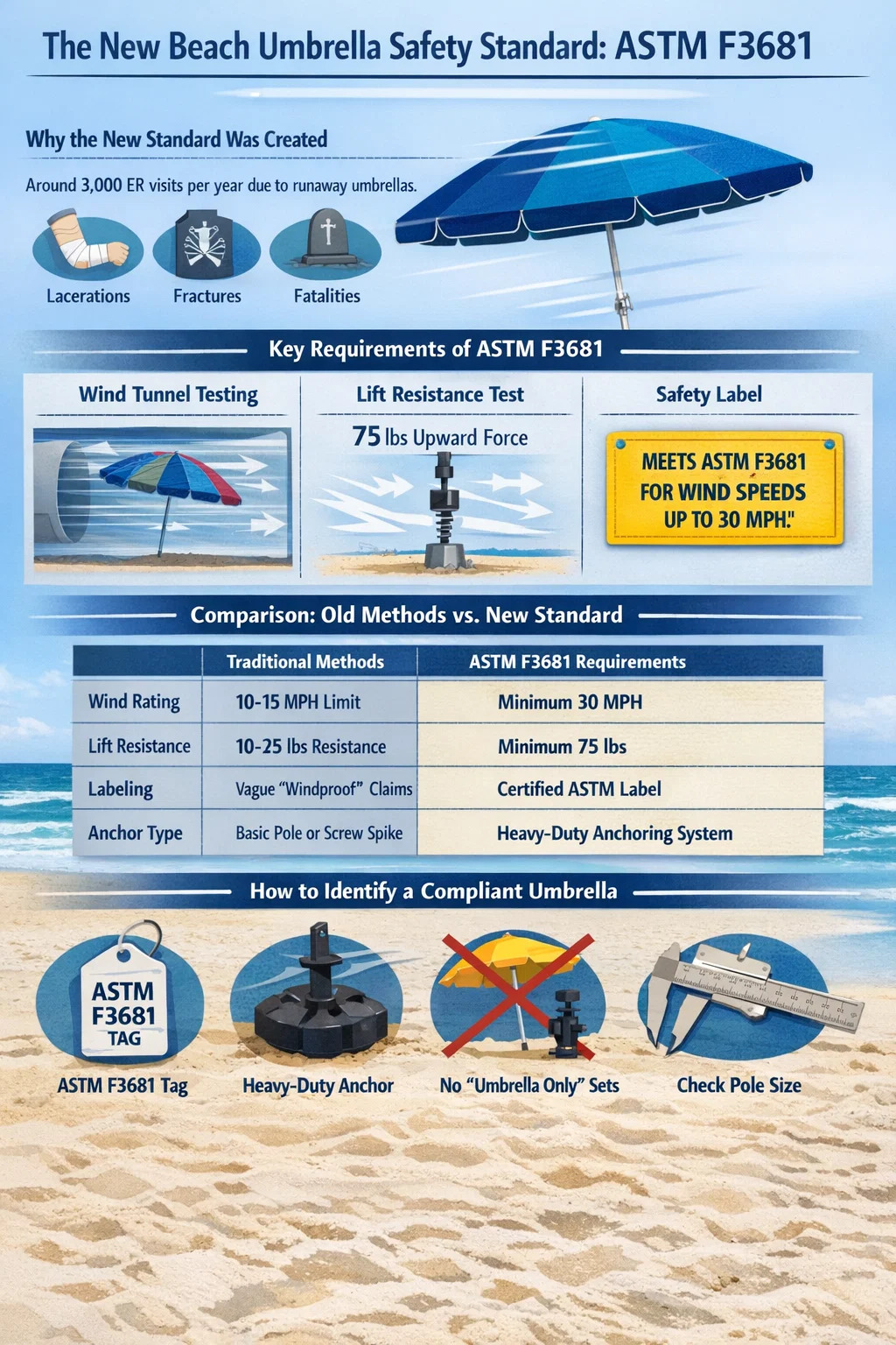 De nieuwe parasolstandaard is ASTM F3681-24 (bijgewerkt naar F3681-25) , waarin de eerste officiële prestatie-eisen voor windweerstand en verankeringsveiligheid zijn vastgelegd. Onder deze nieuwe richtlijn komt er een standaard parasol met een diameter van 7,5 voet moeten kunnen weerstaan windsnelheden tot 30 mijl per uur (MPH) zonder in de lucht te komen. Daarnaast moet het verankeringssysteem minimaal voorzien 75 pond weerstand tegen opwaartse liftkrachten om ervoor te zorgen dat hij stevig in het zand blijft staan.