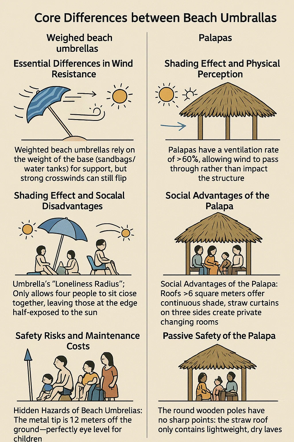 Beperkingen van de parasol tegen de zon: De schaduw onder de parasol verschuift met de hoek van de zon, waardoor regelmatig aanpassingen nodig zijn. De zilveren coating reflecteert de warmtestraling van de grond inefficiënt, dus zelfs 's middags als het zandoppervlak 60°C is, kan de temperatuur onder de parasol nog steeds boven de 40°C uitkomen. Palapa's bieden natuurlijke verkoeling: verdikte palmbladeren absorberen warmte in plaats van deze te reflecteren, waardoor een constante luchtvochtigheid behouden blijft (gemeten op het strand, 3-5°C lager dan onder de parasol); volledige parasol vereist geen aanpassing.