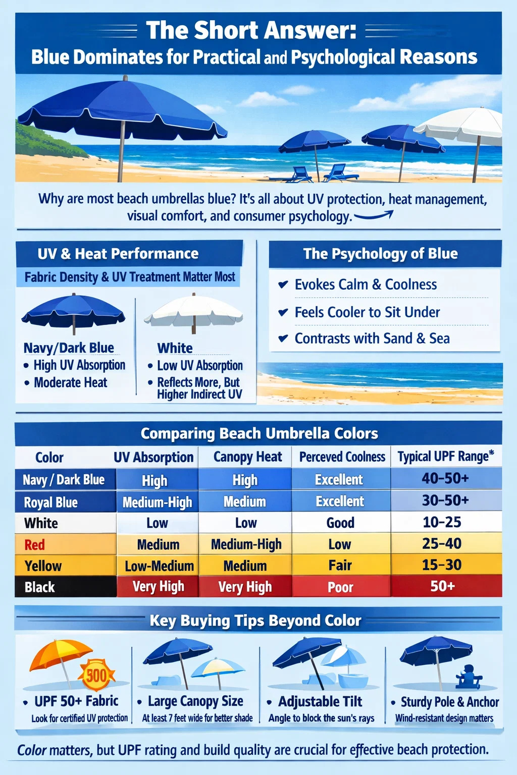 Loop langs welk strand dan ook – van Miami tot aan de Middellandse Zee – en je zult merken dat blauw veruit de meest voorkomende kleur is voor parasols. Dit is niet willekeurig. Blauwe parasols werden dominant vanwege een combinatie van UV-stralingsbeheer, thermische prestaties, visueel comfort en commerciële conventies die zich in de loop van tientallen jaren hadden opgebouwd. Maar kleur alleen vertelt niet het hele verhaal. Het weefselweefsel, de coatingtechnologie en de diameter van de luifel zijn net zo belangrijk als de tint die u uit het rek haalt.